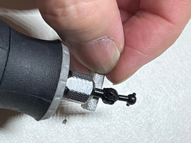 加工はリューターにシャフトを固定し、粗めのスポンジやすりを軽く当てる程度。ベアリングを何度か抜き差ししながら、ガタが出ない範囲で慎重に調整しています。