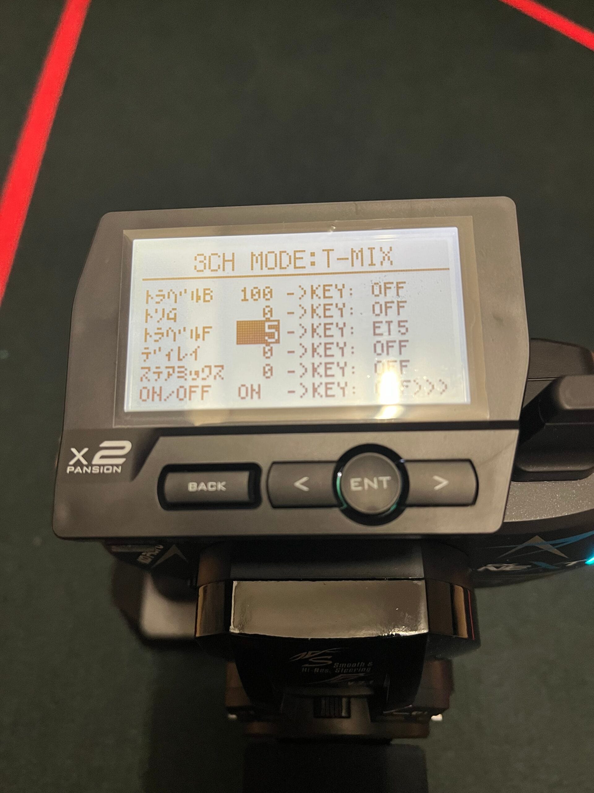 自宅コースは狭く、ステアを大きくしたいコーナーがあるので、ジャイロの設定はアクセルOFFで介入のないT-MIXで5~10%に設定。